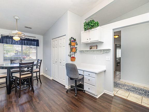 Discover effortless living in this stylish ranch-style condo, featuring vaulted ceilings that enhance its bright, airy feel. With two generously sized bedrooms plus a versatile den, this home is perfect for those needing extra space for work or relaxation. The formal dining room opens to a spacious living area, both finished with rich hardwood floors. A beautiful French door leads to your private patio—ideal for enjoying outdoor dining or your morning coffee.
