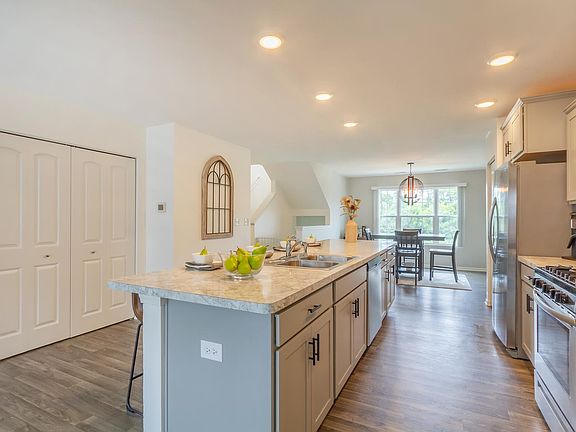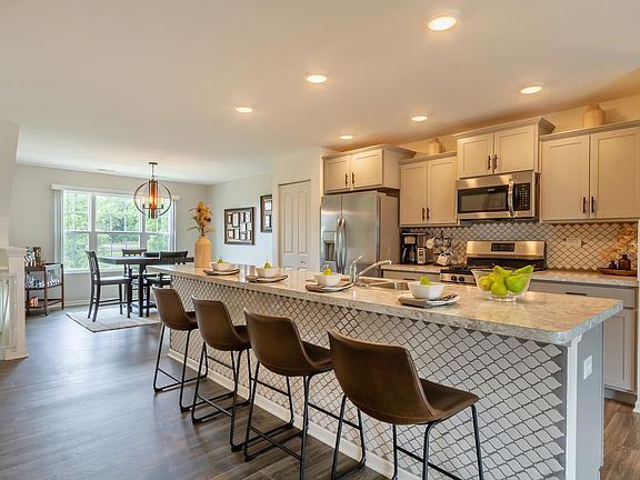 Nothing to do but move into this better than new townhome in Cambridge Lakes. Enjoy resort style living with access to the clubhouse, exercise facilities, pool, and so much more! This open concept floor plan features a spacious family room that opens to the kitchen with backsplash, huge island/breakfast bar, stainless steel appliances, recessed lighting, pantry, and dining area~ perfect for entertaining. Upstairs has a master bedroom with large walk-in closet and en-suite bath with double sinks. There are two additional bedrooms with ample closet space, a full bath, and convenient second floor laundry. The English basement includes a versatile bonus room. Relax on the balcony and enjoy great views of the professionally landscaped common areas and pond. Easy interstate access for commuting. Great home in a great location!