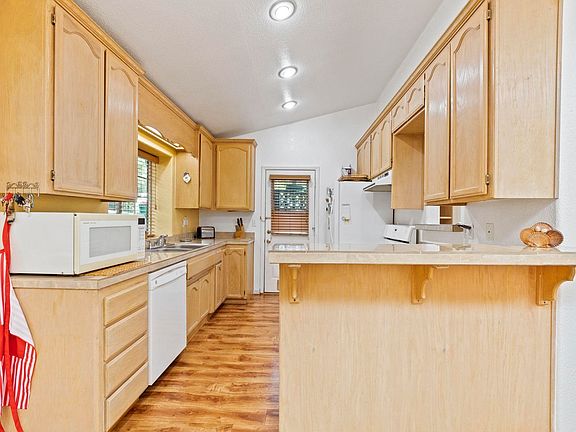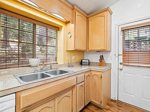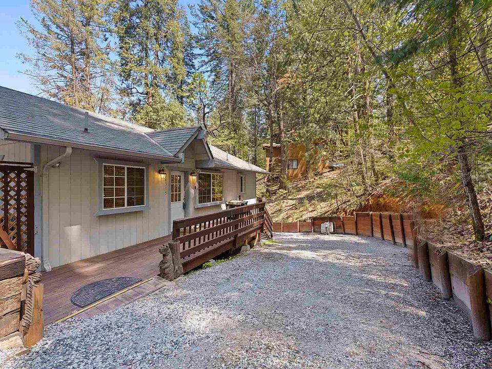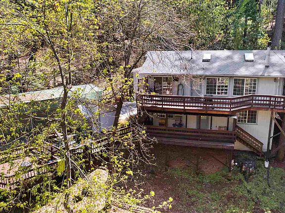 A Cabin in the Sierra Foothill Pines. This well kept home has 3 bedrooms and 3 baths. A parking area with Metal RV Covering, that has its own meter, septic, water and full bath if necessary. Two decks for sitting and enjoying the outdoors and seasonal creek at the bottom of the .45 acre lot. Kitchen has marble tile counter tops. Laminate wood floors. Living room has vaulted ceilings, wood stove and propane wall heater as well. Downstairs bedrooms have small gas wall furnaces. Easy lift is included in the sale. Lots of redwood decking surrounds the cabin with covered woodshed for the firewood. Hot water heater is gas and 50 gallons. Enjoy the 4 seasons at this perfect elevation and walk up to the PGE ditch and hike for miles or fish.