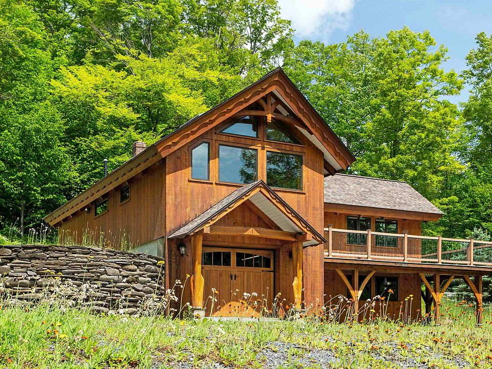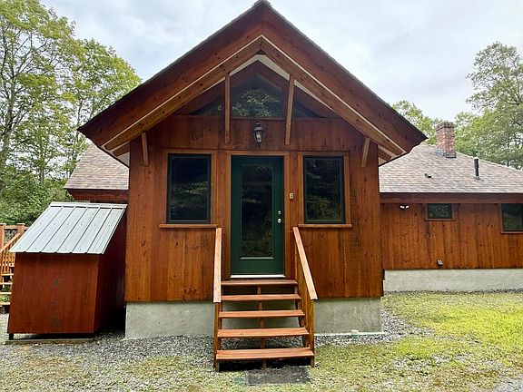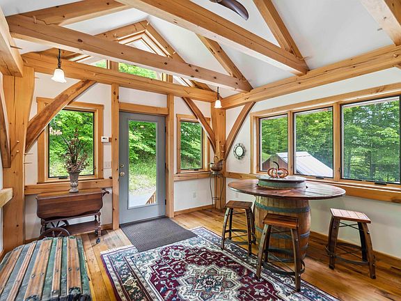 The Lodge, a totally renovated 2-bedroom post and beam house with local views. Brought to a new life in 2014 from the inside-outside with lots of charm and character added. The house is well insulated and serviced by radiant heat, pellet and woodstove. The lower level includes a one-car garage/ workshop, a family room with a kitchenette, custom bathroom, utility room, cozy reading nook, and office, which is currently being used as a bunk room. The main level is outfitted with a lovely entrance/mudroom, which flows to the kitchen and living spaces overlooking local views. The primary ensuite, small bedroom, and custom bathroom complete the main floor living. There’s a wraparound deck for added outdoor living during the warmer months. An old sugar house is also included with the property. The renovations were started, although not finished. The building is solid and weather proofed, skylights are in, structural framing is completed, just waiting to be completed. It could serve as an art studio or studio Airbnb rental. One bedroom septic is in place, spring water unknown. The Lodge and Sugar house is being sold furnished, except for a few personal items.