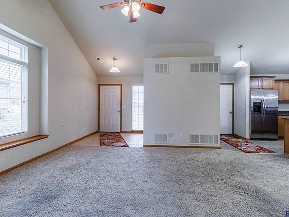 Wonderful zero entry ranch townhome backing to treed common area. This open floor plan with cathedral ceilings and plant ledges offers the kitchen, dining and living room area as all open and spacious. The kitchen is nice sized and has granite countertops, ample cabinets and stainless steel appliances. Includes stackable washer and dryer off kitchen. The primary bedroom has its own bathroom and walk-in closet, and also has a door to walkout to the large private patio area in the back. The second bedroom also has a walk-in closet. The two car garage has pull down stairs offering ample storage. HOA covers lawn care and snow removal, as well as outside water and garbage. SELLER IS OFFERING A FLOORING ALLOWANCE. To be used however buyer desires.