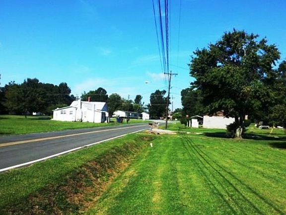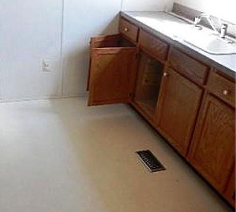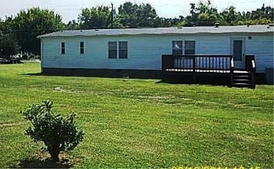 NICE COVERED FRONT PORCH on this 1997 vinyl manufactured double wide home on over half acre with 1836 finished square feet, three bedrooms, two baths, forced air heat with central air, public utilities, wood deck, and flat open lot.