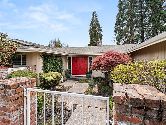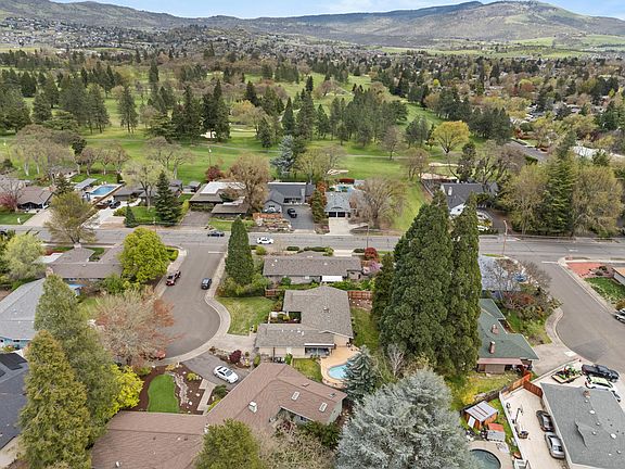 Experience a true mid-century modern home built by A.R. Dubs! This single-level home offers 1,964 sqft with 3 bedrooms and 2 bathrooms, and effortlessly blends mid-century design with contemporary updates. Enjoy vaulted ceilings, LVP flooring throughout, and a striking floor-to-ceiling brick wall fireplace in the living room, plus a cozy gas fireplace and built-in mini-bar in the den. The kitchen shines with polished quartz counters, stainless steel appliances, painted white cabinets and a breakfast bar, while the formal dining room invites gatherings. Both bathrooms feature vintage tile charm. Step outside to your private oasis—an in-ground pool (recently resurfaced), covered patio, pristine low-maintenance landscaping, and serene mountain views. New roof, new Lennox heat pump, and a storage shed complete the package. Located on a quiet cul-de-sac just down the street from the Rogue Valley Country Club and golf course!