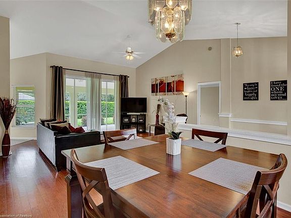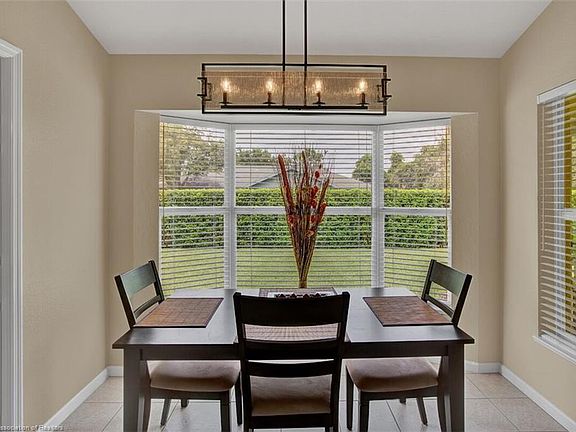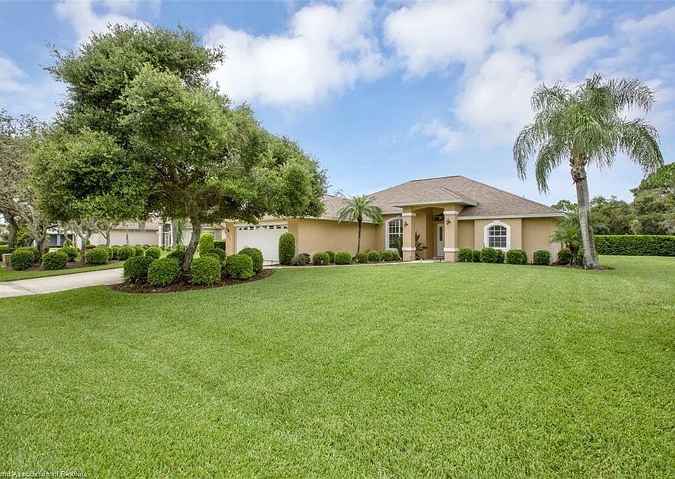 Amazing curb appeal with a well manicured lush lawn (newly updated 6 zone irrigation system) and impeccable landscaping! Mature shade tree in the front yard. Inviting raised roofed front entry. Step inside to a wonderful floor plan. This home features over 1900 square feet of living space. Split floor plan offering 3 bedrooms and 2 full bathrooms, No carpet anywhere in this house. Wood laminate floors and tile throughout. Vaulted ceilings and meticulously maintained. The living room/dining room have a large picture window and sliding doors to the screen porch that allow LOTS of natural light in. Large white kitchen. The cabinets have crown molding accent on the top. Quaint breakfast bar overlooking the breakfast nook. The master bedroom is large - featuring a private master bath with his and her sinks and walk in shower. Large walk in closet for great storage. Two additional bedrooms and full bath on the other side of the house. Large indoor laundry complete with wash sink. Attached 2 car garage with golf cart garage too. Huge screen porch that overlooks the beautiful back yard. Updates include but are not limited to: NEW Flooring, NEW paint, New refrigerator, NEW fixtures throughout, NEWLY updated irrigation, NEW extensive landscaping. Move in ready!!