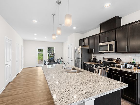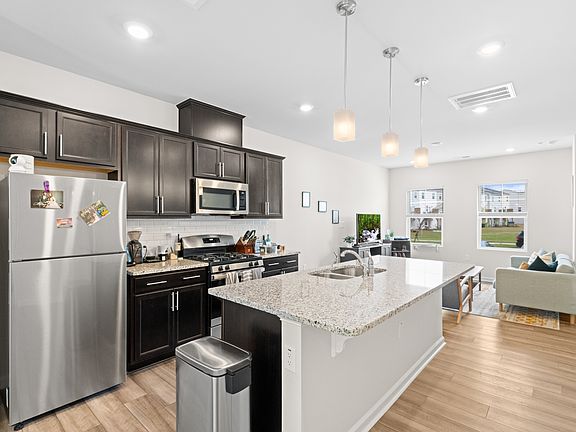 Step inside to a bright, open-concept layout featuring luxury vinyl plank flooring, recessed lighting, and plenty of natural sunlight. The kitchen is fully equipped with stainless steel appliances, granite countertops, a gas range, subway tile backsplash, and a large island with bar seatingideal for entertaining or casual meals.