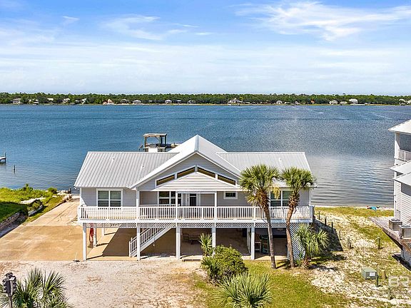 Experience coastal living on both sides of paradise at 2432 W Beach Blvd, where Little Lagoon stretches behind you and the Gulf of Mexico sits across the street. Located in a private setting on just over an acre, this home puts you minutes from the heart of Gulf Shores attractions while offering a quiet retreat where you’ll enjoy boating, fishing, and stunning Gulf Coast sunsets. Set along a deep stretch of Little Lagoon, ideal for fishing, you can cast a line from your own pier or head out on the water with ease from your private boat launch! Two nearby beach access points also make it easy to enjoy the sugar-white sands of the Gulf. Following Hurricane Sally, the home received a new metal roof, HVAC systems, Hardie board siding, windows, and sliding glass doors (2020–2021). A new fireplace was added in 2016, and in 2023 new blinds were installed throughout. Inside, vaulted wooden ceilings and expansive windows fill the main living area with natural light and spectacular lagoon views. Featuring two sinks, bar seating, tile flooring, and custom pendant lighting, the kitchen flows seamlessly into the dining area and living room, highlighted by a wood-burning fireplace. With a functional layout of two bedrooms on each side of the home, the lagoon-front bedrooms enjoy direct access to the back deck through sliding glass doors, offering peaceful water views. The home’s two full bathrooms include one with a custom-tiled walk-in shower and another with a tub/shower combo. A spacious covered back porch overlooks the lagoon and leads to a private pier with a covered boat slip equipped with electric and water. Beneath the home, a storage room with half bath, outdoor shower, and fish cleaning station make beach outings and fishing trips a breeze. Whether you’re looking for a private second home or a profitable vacation rental with projections between $55K–$88K, this property excels with its outdoor living spaces! Buyer to verify all information during due diligence.