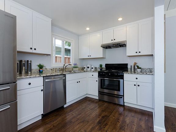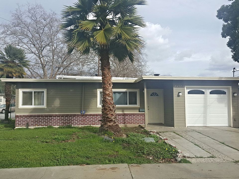 Home has been updated and boasts an open floor plan. Home features a kitchen with crisp white cabinets, stainless steel appliances and granite counters. Living room has a wood burning fireplace and opens onto the dining area. Updated bathroom features a shower over tub and tiled floors. Just freshly painted inside and out in decorator grey tones with white trim. Dual pane windows. Large corner lot with storage shed included in rear yard. Back yard has large double gates to allow the parking of an RV or boat off the street, on this corner lot. Conveniently located, just minutes to downtown Hayward, with Farmers Market on Saturdays. Easy access to freeways, Mission Boulevard, and BART for commute. Short distance to California State University, East Bay, and the Hayward Plunge Trail, for hiking or mountain bikes. Very easy access to Route 92 and the San Mateo Bridge, for those working across the bay.