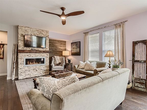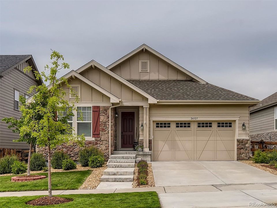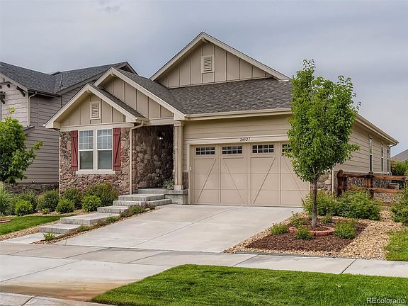 Absolutely charming ranch home in the popular Ponderosa Ridge neighborhood. No stone unturned in this upgraded beauty! With three bedrooms, plus a den/study, this home lives large. Custom wainscoting in the front hall leads to the two front secondary bedrooms and a full bath complete with granite and two sinks. A den/study runs off the back hall and serves as a private retreat for reading or office work. The open concept living area will take your breath away. The gourmet kitchen is open and bright with upgraded KitchenAid appliances including a double wall oven, gas cooktop, dishwasher and refrigerator. Sprawling granite countertops are complemented by new subway tile backsplash and pendant lighting. A walk-in pantry offers valuable storage. The spacious Great Room has a custom stacked stone fireplace and adjacent wood plank accent wall. Spacious Primary Bedroom off the great room has two walk-in master closets and five-piece tiled bath with two sinks. Unfinished slab basement includes rough-in for future expansion, a 220 outlet, large crawl space, and custom powder coated window well coverings. Outside, a charming patio is adorned with two privacy screens, perennial garden and newly planted trees. The south facing front means Mother Nature will assist with those winter storms! Additional amenities include engineered hardwood floors, brand new A/C in June 2022, new carpet in May 2019, New roof in 2021 and new interior paint. This one is sure to delight! Call listor for possession details.