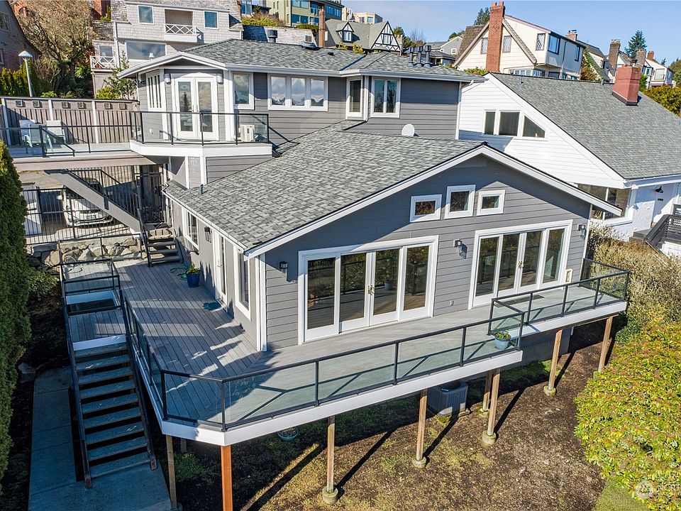 Magnificent views of downtown and unobstructed view of Mt Rainier from 1000 foot decks on the main level and the primary bedroom area on the 3rd floor. The main floor open concept includes high end double sliding doors extending across the living room and dining room. The kitchen features open concept granite tops and seating at the bar for many guests. The 3rd floor primary bedroom includes a private viewing deck with views from the city to the sound. A large closet with its own hi tec washer and dryer leads to a bathroom featuring a large walk in shower and large soaking tub. Wake up to beautiful sunrises and enjoy sunsets from your private deck. The basement is an open book design it for an ADU. Landscaping is professionally maintained