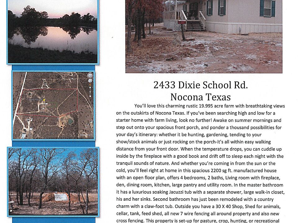 You’ll love this charming rustic 19.995 acre farm with breathtaking views on the outskirts of Nocona Texas. If you’ve been searching high and low for a starter home with farm living, look no further! Awake on summer mornings and step out onto your spacious front porch, and ponder a thousand possibilities for your day’s itinerary: whether it be hunting, gardening, tending to your show/stock animals or just rocking on the porch-it’s all within easy walking distance from your front door. When the temperature drops, you can cuddle up inside by the fireplace with a good book and drift off to sleep each night with the tranquil sounds of nature. And whether you’re coming in from the sun or the cold, you’ll feel right at home in this spacious 2200 sg ft. manufactured house with an open floor plan, offers 4 bedrooms, 2 baths, Living room with fireplace, den, dining room, kitchen, large pantry and utility room. In the master bathroom it has a luxurious soaking Jacuzzi tub with a separate shower, large walk-in closet, his and her sinks. Second bathroom has just been remodeled with a country charm with a claw-foot tub. Outside you have a 30 X 40 Shop, Shed for animals, cellar, tank, feed shed, all new 7 wire fencing all around property and also new cross fencing. This property is set-up for pasture, crop, hunting, or recreational use leaving you plenty of potential of endless possibilities!