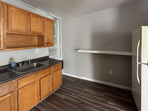 The kitchen is equipped with attractive honey-toned wooden cabinetry for excellent storage, dark countertops, a stainless steel sink, and a practical floating shelf. A neutral color palette of soft grays and whites provides a versatile backdrop for personal decor. With baseboard heating and subtle architectural details like high baseboards, this apartment prioritizes functionality and style in a compact, efficient space.