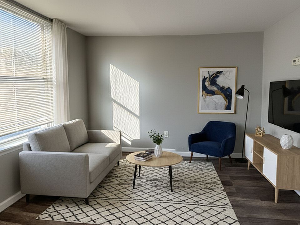 This two-bedroom apartment in Philadelphia is designed for efficient urban living, thoughtfully laid out across a single floor. The space features an updated kitchen, a full bathroom, and two distinct bedroom areas, including a generously sized primary bedroom with two large windows for ample natural light. The apartment maintains a cohesive aesthetic with durable wood-look flooring throughout.