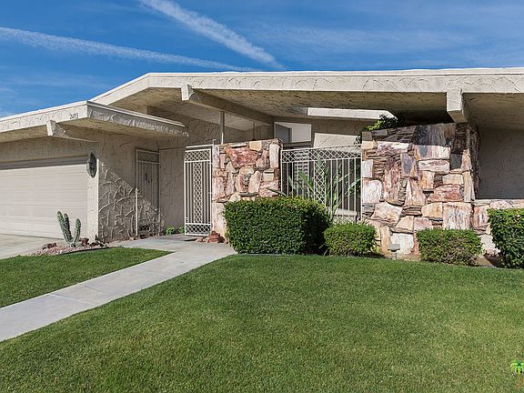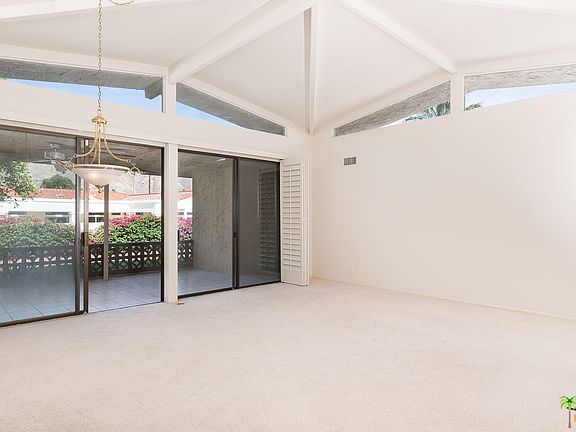 This private, stylish two bedroom home is outstanding with stunning mountain views. The front of the property features iconic stack stone accents, a courtyard, and double front doors. The formal entry leads to an open vaulted living space with clerestory windows above. These provide mountain peaks views, while two sets of sliding doors below lead to a covered patio with panoramic vistas. Located on the western edge of Canyon Estates, this home sits on the ample green space buffering the complex from the adjacent single family, residential community. The completely remodeled kitchen opens to the covered porch, and has counter-seating for 3-4. The adjacent laundry area connects the kitchen to the two car garage. The first bedroom is situated just off the entry, and could double as a den or TV lounge. The hall bath is near by for easy access. Down the hall is the master bedroom with two closets and an en suite bath. Thoughtfully and meticulously remodeled, this home is a classic with a modern twist.