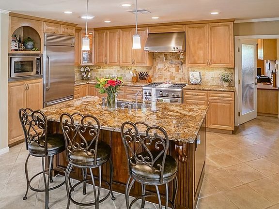 True pride of ownership!!! Beautiful home on cul-de-sac. Some of the many features in this remodeled home include paver driveway, newer windows, siding, a/c & copper plumbing! Custom designer touches throughout this home! From the double leaded glass entry doors to the elegant formal living room with upgraded carpet, recessed lites and custom dual sided fireplace in both living room and dining room! Gourmet kitchen with gleaming granite counter tops, stainless steel appliances, instant hot water, Monogram refrigerator and range with pot filler, Fisher & Paykel 2 drawer dishwasher, center island with breakfast bar, upgraded cabinetry with under cabinet lighting and soft close doors. Custom wall painting in family room adds to the charm plus a bar and custom lighting. Great office with built in desk and cabinets. Downstairs master bedroom with sitting area, ceiling fan, a walk in closet plus another closet with mirrored wardrobes. Master bath features huge walk in shower with custom tile work, granite counter top with dual sinks. Secondary downstairs bedroom has it's own full bath! Two more bedrooms upstairs plus bath! Entertainer's yard recently landscaped and hardscaped! Covered patio area off the home, stacked stone U shaped bar with built in BBQ & open lattice patio with custom lites, fire pit, stacked stone spa with raised back wall and water fall feature. There is also a raised terrace with putting green!