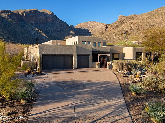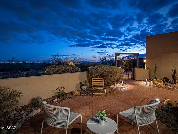 Nestled within the prestigious, cobblestone-lined streets of The Enclave at Pima Canyon in the exclusive guard-gated community of Sin Vacas, this privately situated residence offers an unparalleled connection to the vast and rugged beauty of the Catalina Mountains. Thoughtfully crafted with a refined sense of design, proportion, and materiality, this timeless property embodies classic detailing with modern elegance. The flexible floor plan, featuring four bedrooms and four bathrooms, seamlessly balances form and function, creating an inviting living environment where every detail has been carefully considered. At the core of the residence, the chef's kitchen is a study in material contrast and precision craftsmanship. Custom millwork defines the space, where knotty alder natural wood cabinets meet a striking sage green center island. Expanses of white quartz surfaces establish a serene, monolithic quality, reinforcing a sense of clarity and restraint. Flowing seamlessly into the adjoining dining and formal living areas, the kitchen fosters an atmosphere that encourages both gathering and quiet reflection. From the great room, large glazed openings frame the surrounding landscape, allowing natural light to animate the interiors throughout the day. Multiple points of egress dissolve the threshold between indoors and out, cultivating a continuous spatial dialogue between the architecture and the rugged desert terrain beyond.
