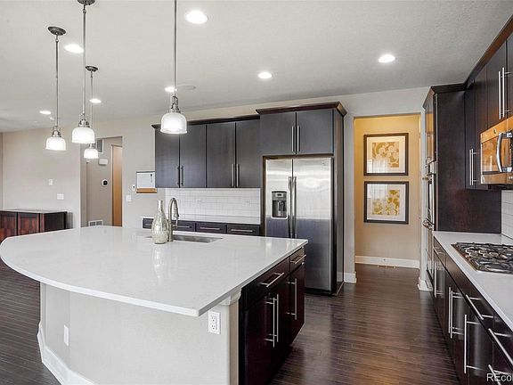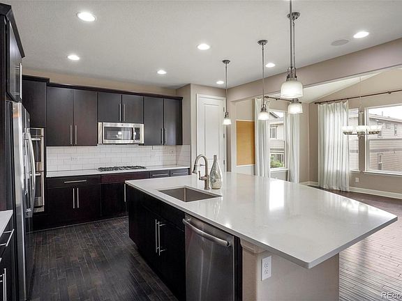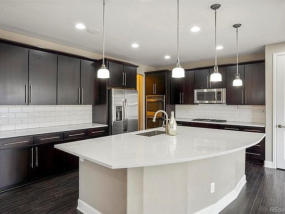 Move in ready with finished basement! This gorgeous home greets guests with a grand two-story entry and continues to impress with an inviting great room with full tile contemporary fireplace, gourmet kitchen with stunning oversized center island and bright vaulted Sunroom. Upstairs, you'll find a loft, three large bedrooms, including a master suite with deluxe master bath highlighted by a beautiful expanded shower and walk-in closet. The finished basement adds a spacious recreation room, 4th bedroom and 3/4 bath. The kitchen has stainless steel appliances with gas cooktop, double oven, microwave, counter depth refrigerator, dishwasher, single bowl sink and subway tile back splash. Crystal Valley Ranch has much to offer, featuring miles of trails, wide open vistas, multiple parks, the pinnacle recreation center that includes a fitness center, and the community pool and clubhouse. Also, conveniently located with easy access to shopping, dining, and historic downtown Castle Rock.