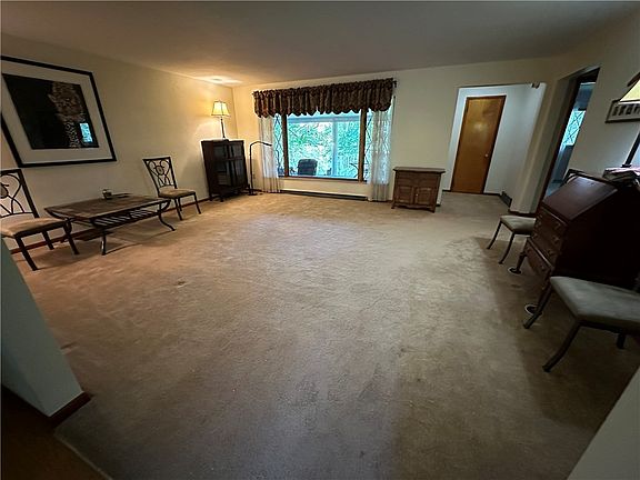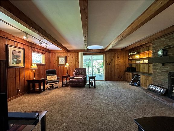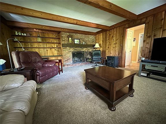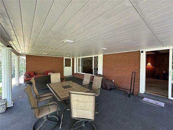 Discover this stunning private hilltop retreat on 5.45 acres in the Elizabeth Forward School District! The home features a 20x40 in-ground heated swimming pool, beautifully updated kitchen with quartz countertops, pantry and a cedar breakfast area with Jenn Air grill. Picture windows offer views of a backyard teeming with wildlife. Start your mornings on the 22x26 patio amidst a mature perennial flower garden. Inside, find a formal dining room with hardwood floors, a large living room with picture window, and a 38x16 covered front porch for entertaining. The main level includes three bedrooms, with a downstairs bonus room that can serve as a fourth bedroom or office. The cozy cedar family room boasts a wood-burning fireplace, built-in desk, and shelving. The remodeled basement is perfect for entertaining, propane fireplace, custom L-shaped bar with Brazilian granite, living area, bathroom, and storage room.