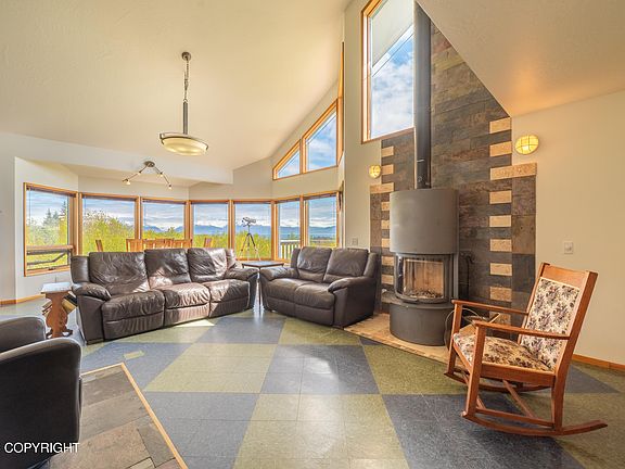 One of the best views in Homer! Beautiful 4 bedroom, 3.5 bath home on the desirable Homer Bench, has been lovingly cared for by year-round residents. Just three miles from the city center yet incredibly private, this home has easy access to schools, the Spit, beaches, and shopping.Spacious modern kitchen with a large center island offers two sinks and vast storage and counter space.Two separate bedroom suites, both with gorgeous views, and a second, lower-level kitchenette make this a great fit for families welcoming visitors or owners considering rental options. With sweeping views of glaciers, Kachemak Bay, and mountains, full of space and light, this home offers both indoor and outdoor appeal. Adjacent property is protected by a conservation easement, offering long-term privacy and unobstructed views. 2023 natural gas boiler and new kitchen range. Both decks rebuilt in 2023. City sewer service in place.