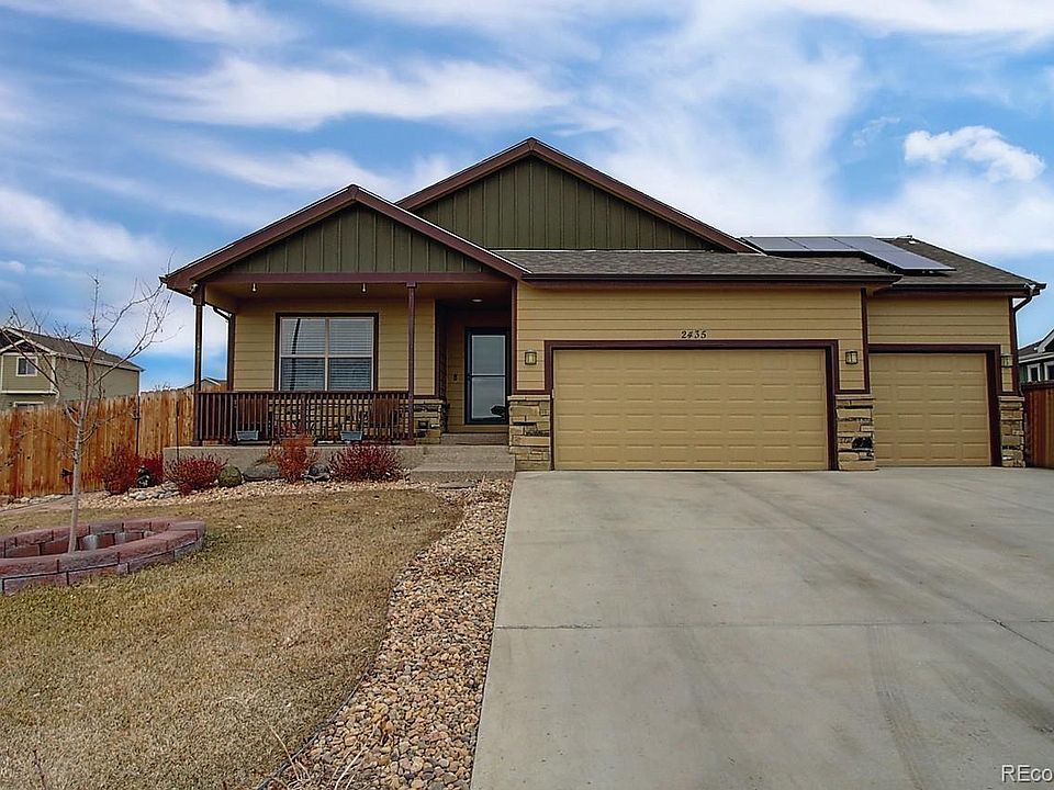 Welcome to your forever home! Your future home is this 4 Bedroom, 3 Bathroom raised ranch with finished basement. Covered patio and big foyer welcomes you to open floor plan; Family Room with gas fireplace and vaulted ceiling, dining area, and Kitchen. Kitchen features granite-slab countertops, decorative tile back splash, gorgeous reclaimed oak wood floors, and stainless-steel appliances with gas range. Main-floor Master Bedroom features private bathroom with dual sinks, and walk-in closet. Finished basement has Rec Room, Family Room, and guest bedroom and bathroom. Entertain friends and family on the covered back patio while kids and pets run and play in the spacious back yard with 3 raised garden beds for your green thumb! Keep furry family members safe in the big dog run! Finished 3-car garage features built-in cabinets and slat wall--perfect for projects! Save money w/ the 5.75 KW solar system! Walk to numerous parks, pools, & Knowledge Quest Academy K-12 charter school! Call now!