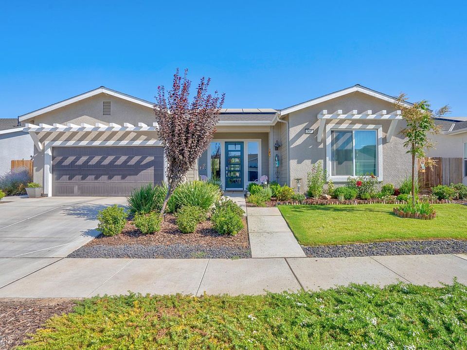 Welcome to your North Merced Lennar Sundance Home! Covered porch in the front enter your cozy entry. Formal dining room. State of the art gourmet kitchen features stainless-steel appliances, island with breakfast bar, quartz countertops with tile backsplash, space for an extra-large refrigerator. Ceiling fan in the living room. Carpet in each bedroom. Hallway bathroom includes quartz countertops with double sinks and a shower over tub. Indoor laundry room with counter and cabinet space and extra storage room. Master bathroom features quartz countertops with double sinks with an oversized walk-in shower stall. Top of the line water filtration system. Enclosed patio over concrete in the backyard. Solar is leased.