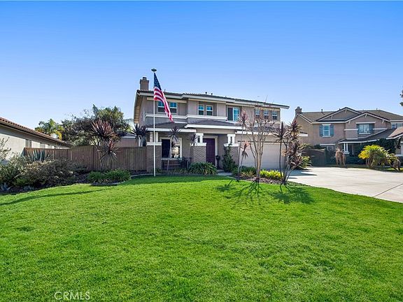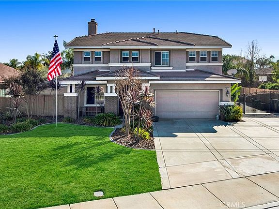 Back on the market- Buyers could not perform-There loss is your gain--SPLISH, SPLASH, YOUR WAY THROUGH THE SUMMER IN YOUR RESORT STYLE BACKYARD. I ask you…is it time for you to own the home of your dreams? If so, look no further—it has arrived. This home is situated on a cul-de-sac street, offering a substantial lot size of 10,454 that has a dream backyard & home. The rear yard is an entertainer’s paradise which is flanked by swaying palm trees with amenities that include a custom pool and spa, putting green, built-in stone island with gas BBQ, refrigerator, AstroTurf lawn plus an extra-large alumawood patio cover W/ceiling fans. The oversized parking area has a large custom iron gate that has plenty of room for your vehicles, toys & boat making this perfect for those who love to play in the outdoors. The additional side yard with tuff shed & vinyl fencing is a perfect space for pool toys, etc. The front of the home offers, lots of lush green grass, flag pole, & oversized driveway that has room for several cars. As you enter the home, you’ll notice a spacious living room with laminate flooring, high ceilings with recessed lighting. The kitchen & family room to the rear of the house is one of the highpoints. Featuring stainless steel appliances, tumbled marble countertops & backsplash, a center island, walk-in pantry, built in buffet that offers lots of counter space & plenty of room to cook as well as entertain. The adjacent dining room extends into the family room area which includes a fireplace providing a cozy space to curl up and relax at the end of the day. The entire space is flooded with natural light, thanks to the abundance of windows throughout, as well as full view of the backyard. As you ascend up the stairs, you’ll surely notice the custom iron railing that encompasses the stairs as well as the second level. At the top the stairs you’ll see a large open loft area that can offer you that 5th bedroom, game room or a 2nd family room, if need be. The upper level of this home also offers four bedrooms and two full bathrooms with the primary bedroom separated from the other three. The primary suite has a large walk-in closet with a spacious bathroom offering dual sinks, separated glass enclosed shower and a large soaking bathtub. The three additional bedrooms are quite spacious in size with two of the bedrooms offering views of the foothills. The home also has solar. Are you ready to call this house your home?
