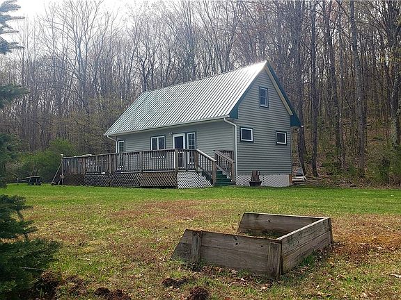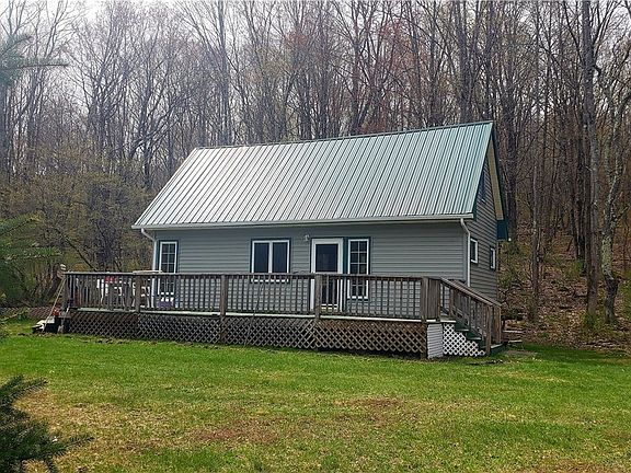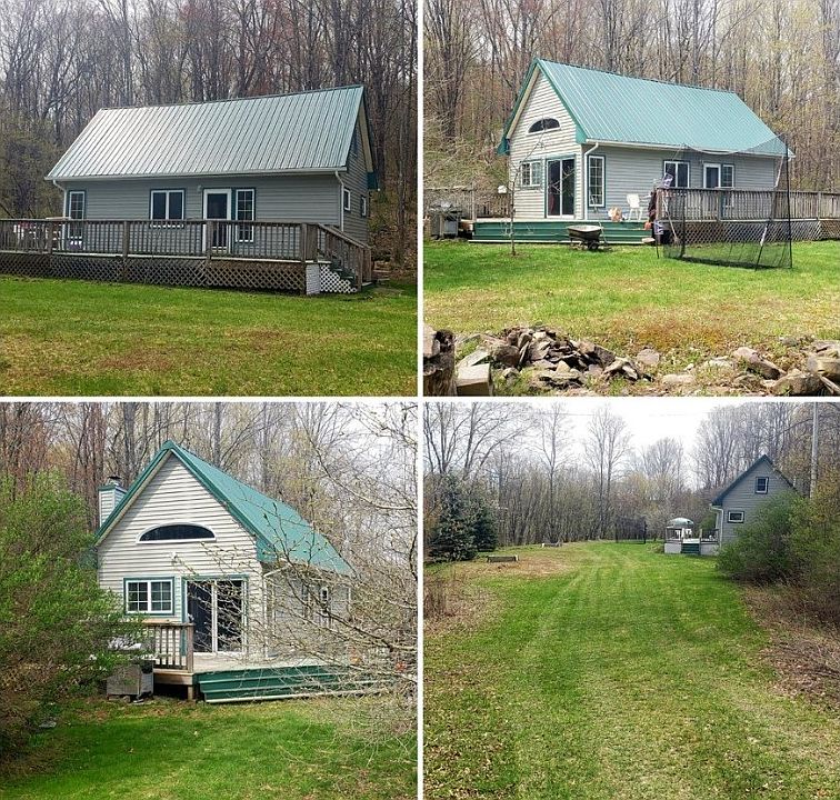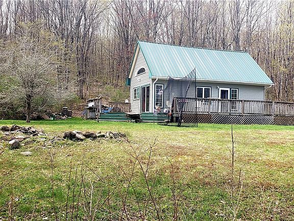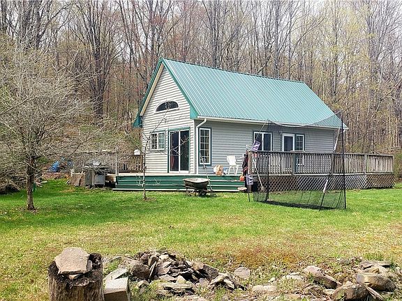 No well? Oh well, but this affordable opportunity to grab a piece of the Catskills has everything else you need to enjoy this three season cabin on nearly 20 acres of land with a stream and sloping woods up the mountain filled with wildlife to explore. Cross the bridge on a private road just off route 23 outside of Stamford, NY to find a solidly constructed, approximately 650 square foot cabin built on 6x6 piers 2x6 walls, metal roof, vinyl siding, new windows/doors, wood stove, sleeping loft, separate small bedroom and updated electric. There is an 1,100 gallon septic tank that is already hooked up to the bathroom with a functioning toilet. Since there is no well or other plumbing, just use the spring for it and all your other water needs. The interior has that hunting camp feel that is ready to finish as you wish and instead spend your time relaxing on the wraparound deck or the flat usable yard that surrounds this “better than glamping” retreat. There is even a shed to store your equipment and tools. This is the home base that is minutes from nearby attractions and amenities here in the Western Catskills that is famous for its golfing, skiing, festivals, restaurants and shops.
