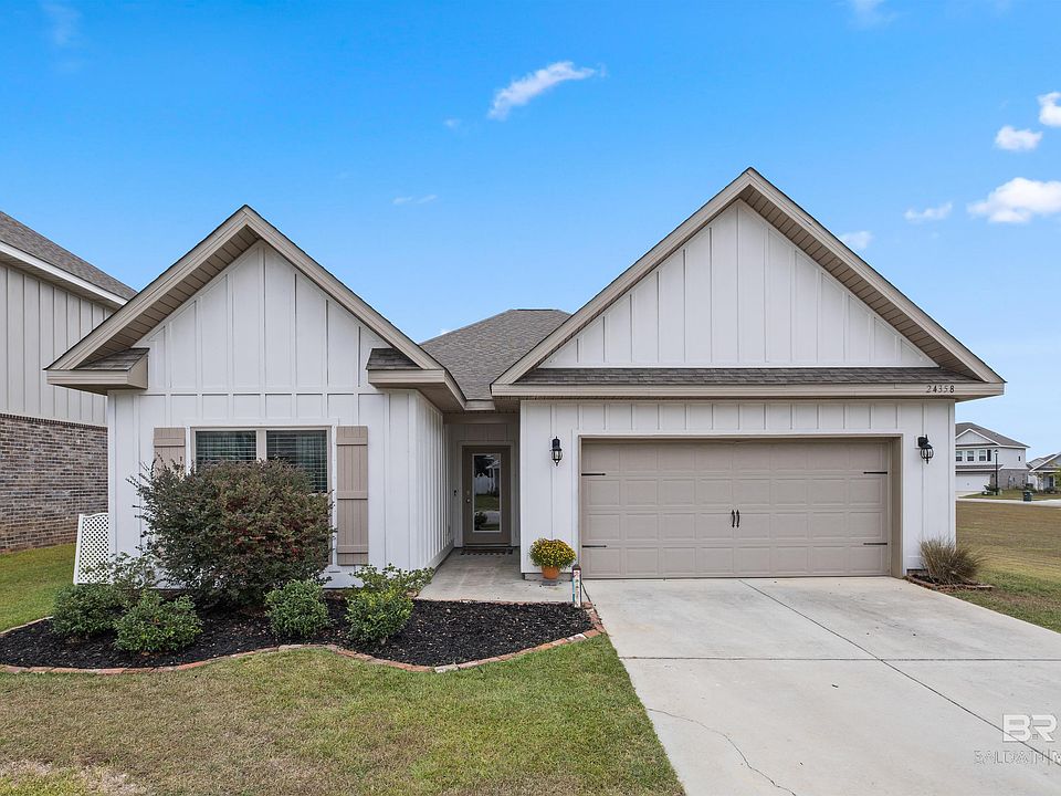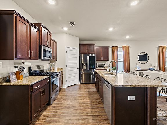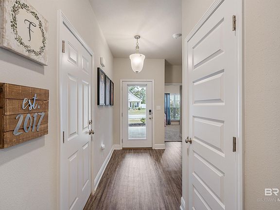 Better than new, this GOLD Fortified 5 bedroom home in Daphne's desirable Jubilee Farms is situated next to a 3/4 acre common green space. It sits in the quiet and completed section, called the Grove, near the front of the neighborhood. The home features a screened porch, blinds, gas range, and completely fenced yard, as well as other tasteful updates added by the owner. Outside curb appeal abounds with the freshly landscaped beds and the newly painted hardie board exterior. Inside there's a spacious open floorplan with plenty of room for a large dining table and a living room with custom built-in's. The recessed lighting and ample sunlight allow it to be light and bright any time of the day. From the living space through the glass French doors is a SCREENED PORCH with its own TV perfect for catching the games this fall. The kitchen has the perfect island for entertaining and food prep, stainless steel appliances, and a corner pantry. You'll find LVP flooring in all of the living space and kitchen and carpet in the bedrooms. The primary at the back of the house is roomy and leads into the ensuite bathroom featuring a garden tub, separate shower, double vanity, and a beautiful barn door leading to the walk-in closet. This one won't last long.
