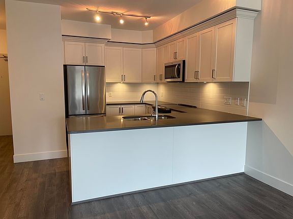 Welcome to LUMIERE, a NEW DEVELOPMENT in the heart of Downtown Port Coquitlam!! This is the LARGEST unit at Lumiere!! TOP FLOOR well laid out open concept 2 bedroom and den and 2 bathroom unit!! Kitchen has quartz countertops, breakfast bar, stainless steel appliances and white shaker cabinetry w/under mounted lighting. Beautiful 12mm laminate flooring throughout w/TJI silent floor system. 9' ceilings throughout w/10' ceilings in the bedrooms for an open and airy feeling. Roughed In Central Vacuum, Smart Thermostat. TWO large covered balconies for your entertaining!! Close to transit, schools and Westcoast Express w/Gates Park just a block away!! Walk to new PoCo Rec Centre!! Pet and rental friendly building. 2 Recreation Rooms for entertaining! Wheelchair friendly. BONUS 2 PARKING STALLS!