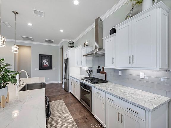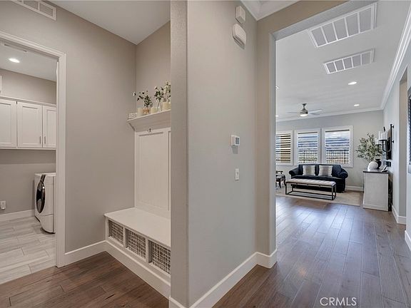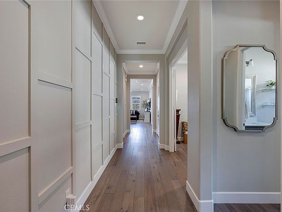 Experience luxury resort- living in the award-winning 55+gated community of Terramor. This Pulte home welcomes you with impressive 10-foot ceilings, recessed lighting, crown molding, shutters, and elegant hardwood floors. The kitchen boasts an oversized island, walk-in pantry and top-of-the-line Whirlpool stainless steel appliances. This home offers versatility space, suitable for an office or den. The primary suite exudes luxury with its dual sinks and a spacious walk-in closet, providing both functionality and comfort. Savor breathtaking sunsets from your California room and relish and expansive 180-degree Mountain View, creating the picturesque backdrop for your home. Terramor offers a vibrant lifestyle with three swimming pools, spa, game room, craft room, event room, full bar, BBQ area, fire pits, gardens, dog parks, sauna, gym, tennis and pickleball courts, bocce, ball, tot lot, and over 5 miles of walking trails. The Clubhouse hosts numerous monthly activities and mini clubs. Conveniently located near shopping and restaurants . This home comes with leased solar, ensuring sustainability and cost savings.