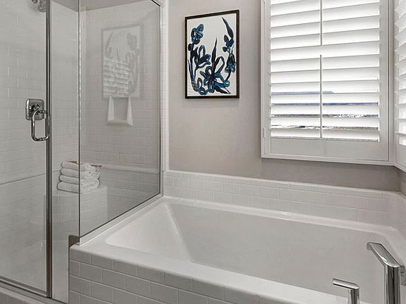 The stunning Plan 4 at Serrano welcomes you from the moment you enter through your enclosed private front porch. With an open concept living, dining, and kitchen layout, you'll make everyone feel cozy in your new space. An extra nook off the kitchen provides for additional cabinets as well as a walk-in pantry for a plethora of storage space. Sliding glass doors lead out to your spacious covered outdoor living area - the perfect place to enjoy a morning cup of coffee or winding down with a glass of wine. Retreat upstairs to your beautiful primary suite, designed for ultimate relaxation with a spacious shower, separate soaking tub, and dual vanities. Two additional bedrooms, a full bath, loft, and laundry room are just down the hall. This home is the perfect size for any sized family. Delightful home amenities include an attached two-car garage, beautiful white shaker cabinetry, granite countertops, a tankless water heater, whole-home air filtration, and other designer touches.