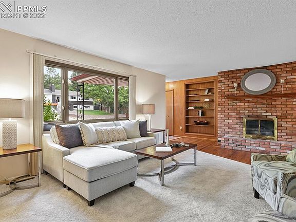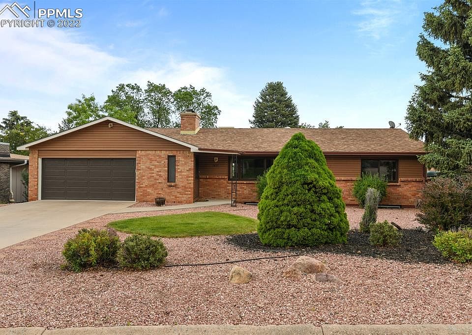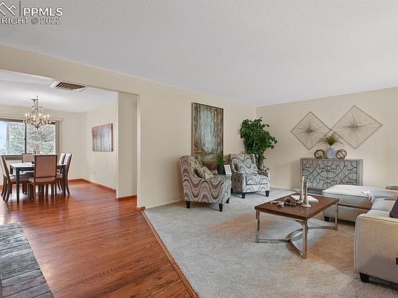 Spacious, attractive rancher in desirable Skyway area on large treed lot. Sweeping views of the city and downtown area from oversized 28 x 15 covered deck. Newer interior paint and carpet, new roof 2021, new sewer line out to street, and newer garage door. Attractive hardwood floors throughout much of main floor. Kitchen with granite counters features breakfast bar and pantry. 3 bedrooms and 2 baths on main floor plus 3 more bedrooms and bath in walkout basement. Two brick hearth fireplaces--one on main and one in basement. Evaporative cooler and attic fan. Fenced back yard. Sprinkler system installed but has not been tested or used by current owner. Lovely neighborhood very close to the mountains, shopping, the Broadmoor, and Bear Creek Park's 500 acres of outdoor activities and walking trails.