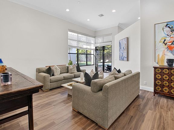 Located in the prestigious village of Oak Run within Broken Sound Country Club, this exceptional one-story residence offers over 2,500 square feet of light-filled living space with soaring ceilings, smooth walls, and a desirable split-bedroom floor plan. The spacious primary suite features an updated ensuite bath with a frameless glass shower door and a large walk-in closet. Two additional bedrooms plus a den provide flexible living for guests, home office, or family use. Enjoy seamless indoor-outdoor living with a covered, screened-in patio overlooking a large private backyard and sparkling pool--perfect for relaxing or entertaining. Impact windows and doors or accordion shutters throughout, along with a full-house generator, offer comfort, convenience, and peace of mind. A rare opportunity to own a beautifully appointed home in one of Broken Sound's most sought-after communities.