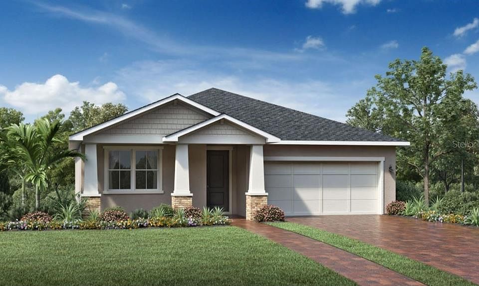 Under Construction. Modern design. The Holden's welcoming covered porch and inviting extended foyer flow into the expansive living room, with a view of the covered lanai beyond. The well-equipped gourmet kitchen is complete with a large center island with breakfast bar, plenty of counter and cabinet space, and ample pantry. The stunning master bedroom is highlighted by a huge walk-in closet and spa-like master bath with dual-sink vanity, luxe glass-enclosed shower, large enclosed storage area, and private water closet. Secondary bedrooms feature sizable closets and shared full hall bath. Additional highlights include a well-lit flex space off the foyer, convenient powder room, and centrally located laundry. Amenities include cabana and pool, playground, multiple walking trails and more!