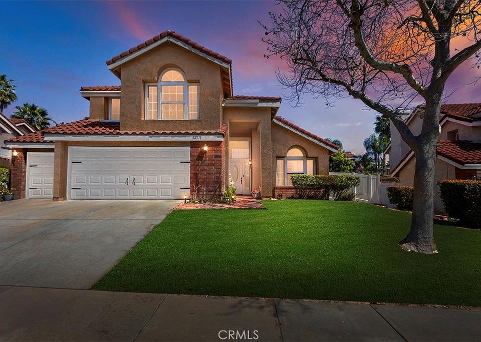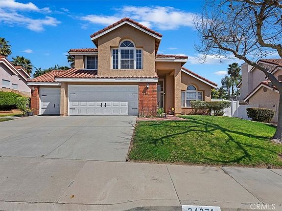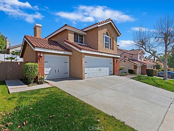 Beautiful Moreno Valley Home, in a wonderful neighborhood with scenic views of the hills. This 4 bedroom 2.5 bath home has been meticulously maintained and taken care of. As you enter the foyer you will notice the tall vaulted ceilings, a spiral staircase and nice laminate floors. There is a semi formal dining area off the kitchen, nice open living room. For relaxation, the home offers a cozy family room with wood and gas burning fireplace. Crown molding surrounds the living room and kitchen. Cabinets have been painted to give a newer feel, granite counter tops, stainless steel appliances with built-in microwave. Large laundry room with lots of cabinet space leads into a large 3 car garage. Upstairs you will find all bedrooms including the Master bathroom with outside balcony, large private tub, walk-in closet, all bedrooms are spacious and perfect for the family. Just minutes to the freeway, walking trails, stores, the Mall, and walking distance to the elementary school.