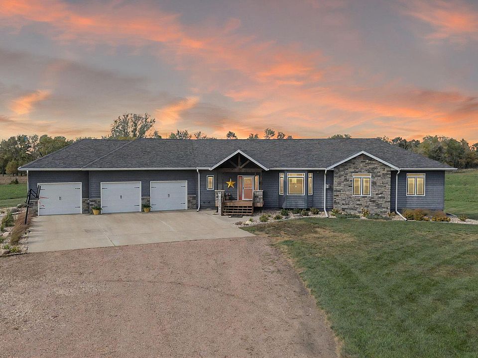 Experience luxury living in this stunning 6-bed, 5-bath ranch on 24 serene acres. Enjoy an open floor plan, chef's kitchen with hidden pantry, and a spa-like master suite. The lower level features a wet bar and gathering space. Includes laundry on both levels, heated 3-stall garage, 3-season room, fire pit patio, 60x80 shed, and wooded/open land--your private retreat awaits!