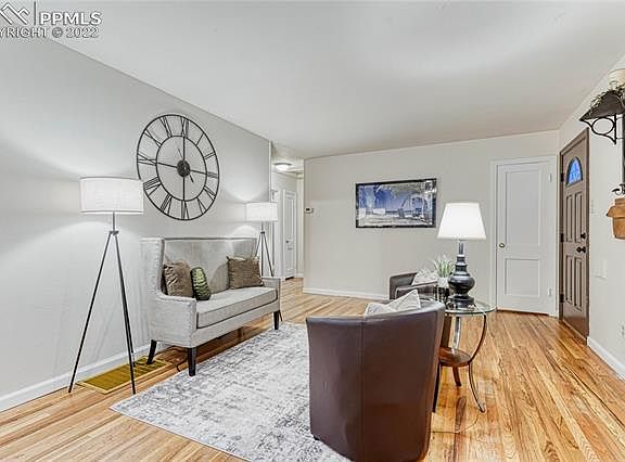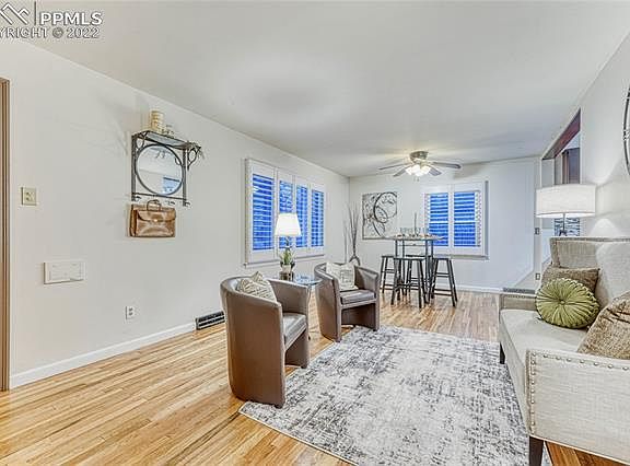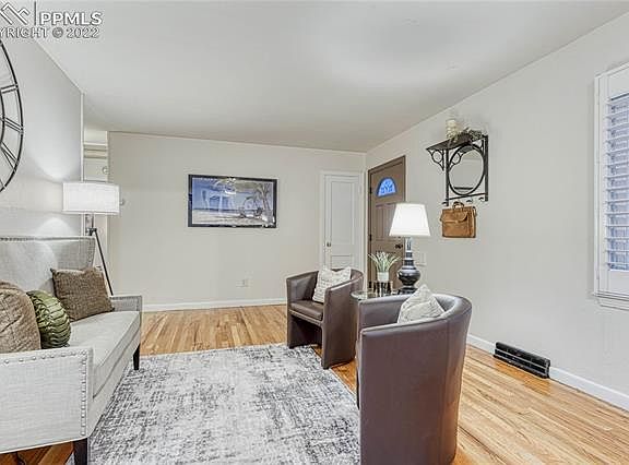 This adorable Rancher is located in the coveted Bonnyville neighborhood. Huge, mature trees line the streets, enjoy a short walk down your block to Bonforte Park. Also a very short walk to Bon Shopping Center which has your local grocery store, Ace hardware, and the fabulous Stir Coffee & Cocktails! This home is only a mile and a half from Patty Jewett Golf Course. You will love your morning/evening strolls throughout this quaint, quiet neighborhood. Mountain and Pikes Peak views from the home and backyard! The large grassy backyard has a huge paver patio with a wood slat pergola above, also a built-in stone fire pit that is gas-lined to the home. The exterior front has a newer, very large, stamped concrete patio, as well as 3 big wood planter beds at the front of the yard to fill with gorgeous flowers! The kitchen has stainless steel appliances and a gas range top, tons of tall cabinet space, custom cut & fitted Quartz countertops, and a Wine Refrigerator. Beautiful, white wood shutter blinds were installed in the living and dining room. Hardwood floors throughout this 1948 built home, with all 3 bedrooms on the main level! An entire brand new sewer line was put in in 2018. A full list of updates with costs will be provided to you when you come to see this wonderful house!! If you are looking for a quiet neighborhood with friendly neighbors, huge mature trees lining the street, and the perfect location with everything you need within walking distance...then this is the home for you!