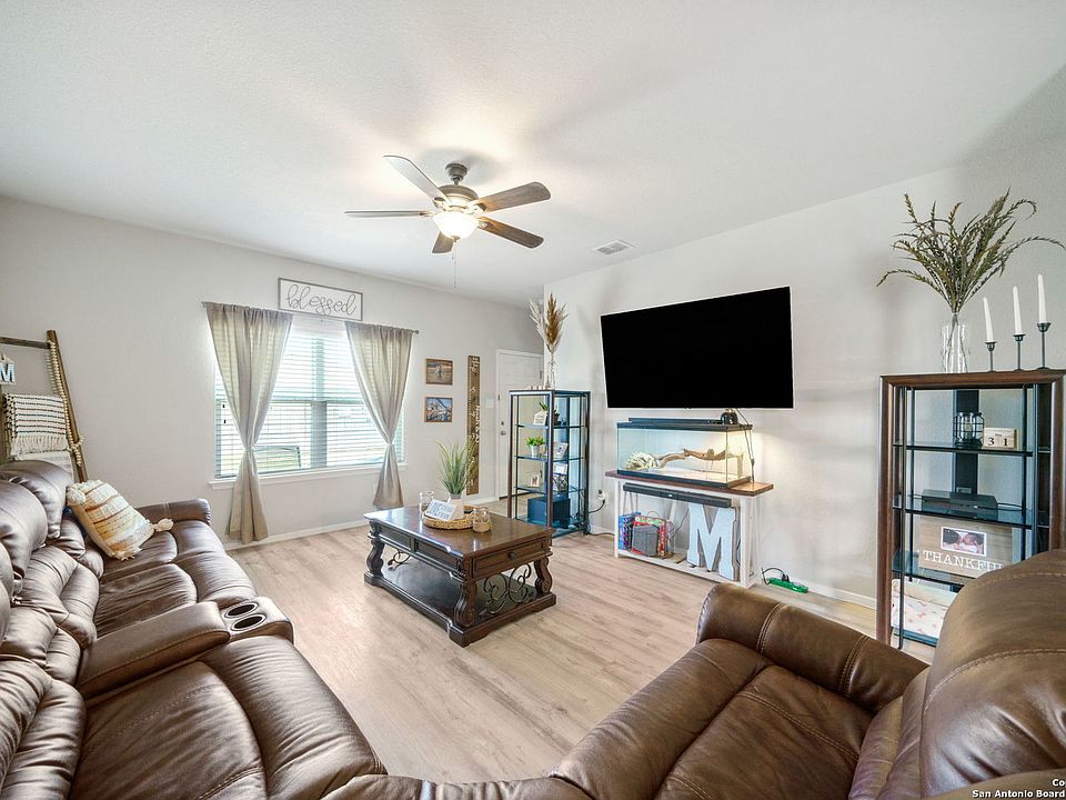 Charming home ready for quick move in. Enjoy the Community Features providing a Pool, Splash Area, Playground & Soccer Fields. This lovely home provides: New Roof, Water Softener, 3 beds, 2 baths with an Open Floorplan, Luxury vinyl flooring in living room, Dining, Kitchen & main walk ways. Quaint Kitchen with great Cabinets, Custom Counter tops, Stainless Steel appliances and Recessed Lighting. Additional features: Natural Light, Builder transferrable warranty, energy efficient, 2 Car Garage and SO MUCH MORE! Conveniently located minutes from HEB Warehouse, Amazon Warehouse, Fort Sam Houston, Randolph AFB, Grocery stores, schools, shopping & more. Schedule your showing today!