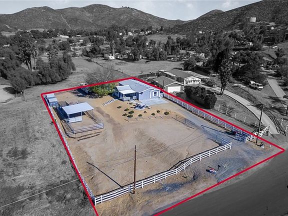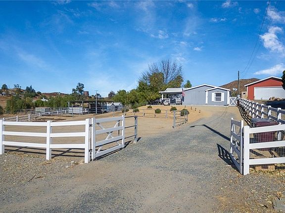 Menifee HORSE property, NO HOA, LOW taxes! This 3 bedroom, 2 bath, single story ranch style home sits on over 1/4 of an acre of horse property with RV parking and room for all your toys. As you enter the privately gated, enclosed property you see the 2 covered horse corrals, hot wire turn around with trailer access at 2 points, tack room, hay shed, with water/wash area and RV hookups. The newly built wood porch is huge and covered with an alumawood patio cover with breathtaking views of the mountains. The yard features lush grass, mature tree, BBQ area and extra large storage shed. As you enter the home you are greeted by cathedral ceilings, LVP flooring, large baseboards, grey paint and an open floor plan. The family room boasts tons of natural light, and is open to the beautiful kitchen boasting upgraded farmhouse cabinets, stainless steel appliances, eat up bar, perfect kitchen nook with tons of space for a large table and access to the in-room laundry room with storage and access to the backyard. The two secondary bedrooms are large with custom paint, plush carpet, tall ceilings and one has wood accented wall and barn closet doors. The secondary bath has been upgraded with custom tile flooring and framed mirror. The gorgeous master bedroom has plush carpet, walk-in closet, chandelier, windows overlooking the yard, featuring a master bath upgraded with wainscoting, custom tile, vanity and mirror, with a soaking tub and standing shower. In the Menifee USD, has 2 APN's. .