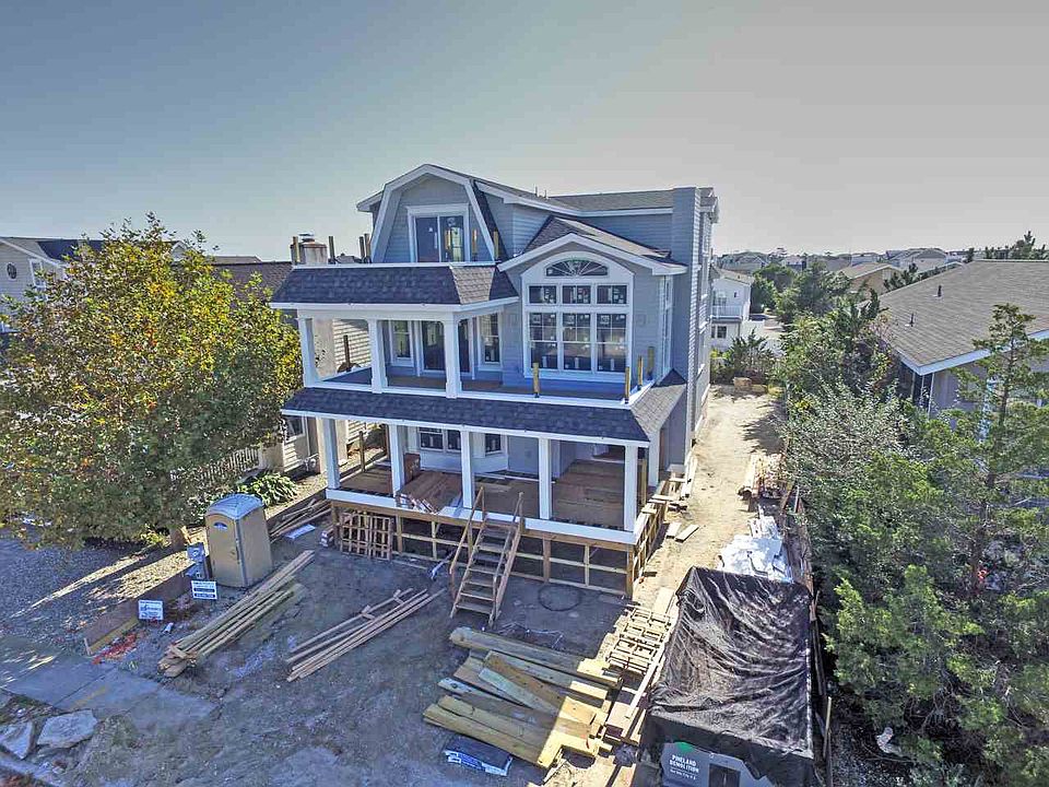 BEAUTIFUL BRAND NEW CONSTRUCTION ONLY A COUPLE OF MONTHS UNTIL COMPLETION. Custom 3 story, upside down style home offering 6 bedrooms, 5.5 beautifully tiled baths, 4 of which are ensuites. Exterior is crisp, Sterling Grey, maintenance-free vinyl shake with a contrasting roof and brick-faced foundation. First floor has an expansive entrance foyer, 2 bedrooms, laundry and a fabulous southern exposed family room spanning the width of the home, overlooking a heated in-ground swimming pool and wonderful cabana. The second-floor great room has a vaulted family room with fireplace, gorgeous custom kitchen with center-island, stone tops and high-end Subzero refrigerator and Wolf range. The great room flows easily to a large, open and partially covered sun deck. There are two additional bedrooms with ensuite baths and a powder room on the second floor. The third-floor master suite flows to a large, private sundeck with views of the inlet and back bays. The master bath is sumptuous and spacious. The 6th bedroom is southern exposed, has its own private deck with beautiful views also overlooking the rear yard and pool. Exceptional features include 5 sundecks and porches, elevator, site finished oak floors throughout, unique covered cabana area, second laundry for the master bedroom, storage and ice machine in the family room. See Associated Documents for detailed floor plans, cabinet and appliance specs.