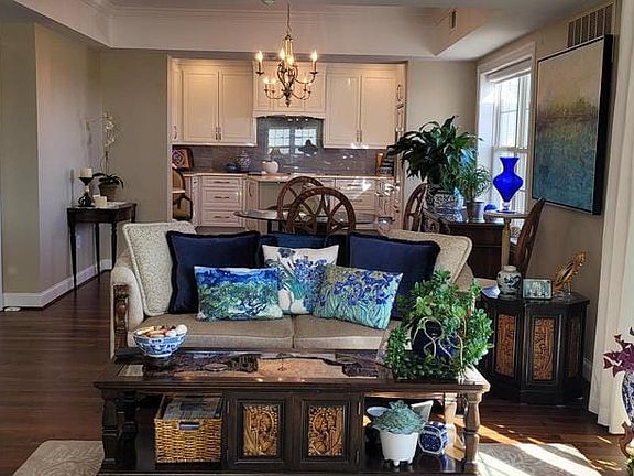 Bright and sunny 4th floor end unit condo. New state -of -the -art Kitchen with top of the line cabinetry, 9 ft ceilings, crown molding and walnut hard wood floors throughout. The open flow concept allows natural light to filter through all of the rooms. A generously sized dining room and kitchen boast 42 inch cabinetry, quartz counter tops and designer appliances, these amenities will surely delight the chef. Just steps away are the laundry room, pantry and storage area. The living room offers triple sliders which lead to the covered balcony and storage area. The king sized master suite offers two closets, bay window and full bath. The second bed room/office and hall bath complete the floor plan. 436 is located steps away from the elevator. You are sure to enjoy the 55+ elegant life style, the club house provides a fire side chat area, banquet facilities, library, TV, billiard and card rooms. The gym and new walk in pool are here for your enjoyment. Handicapped elevator access are steps away from the side entrance. Only a two year lease is acceptable. This condo is available for move in on June 21, 2025 2025-05-23