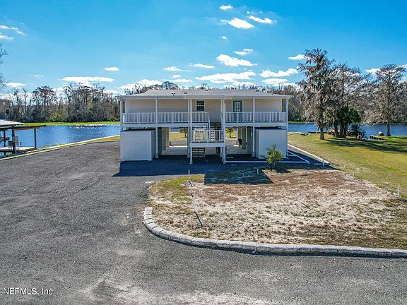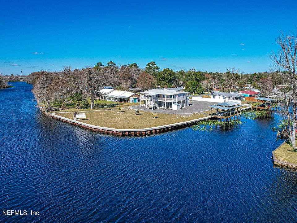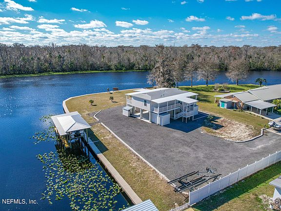 Approx. 331' fully bulkheaded waterfront along canal and picturesque Dunn's Creek w/awesome view of Dunn's Creek State Park. Relax on the covered porch with a cup of coffee & watch the wildlife (otters, manatees, eagles & more) & boats go by the approx. 26'9x12'8 covered boathouse w/electric lift, stainless steel sink, shaded & covered seating area. Comes w/1997, 21' Sun Trac aluminum boat & motor (no trailer). Fully furnished 3BR/2BA home w/2 storage areas underneath. Survey was done when seller purchased the property then tore down the buildings. Bulkhead features 1/2'' steel sheet piles w/1x2' 5000# fiber crete structural cap that has 10-#5 rebar throughout the entire length. Seller giving buyer $15,000 allowance for putting down underground piping & finishing overhang on dock.