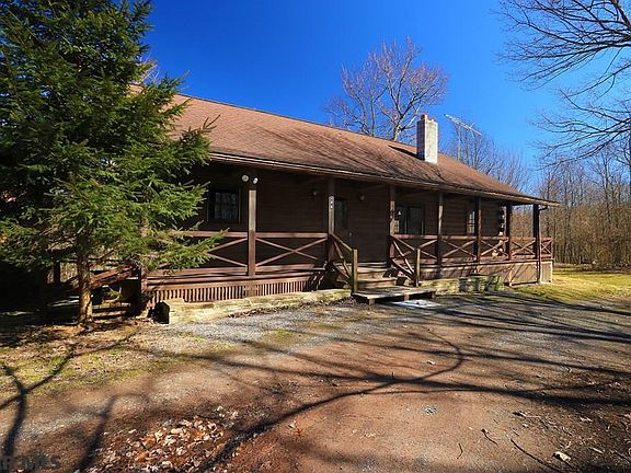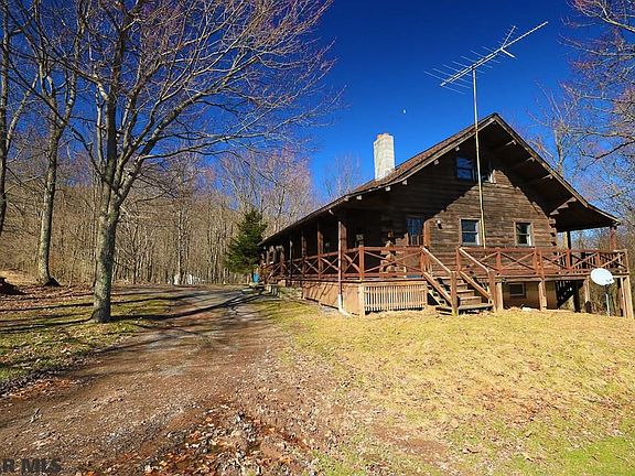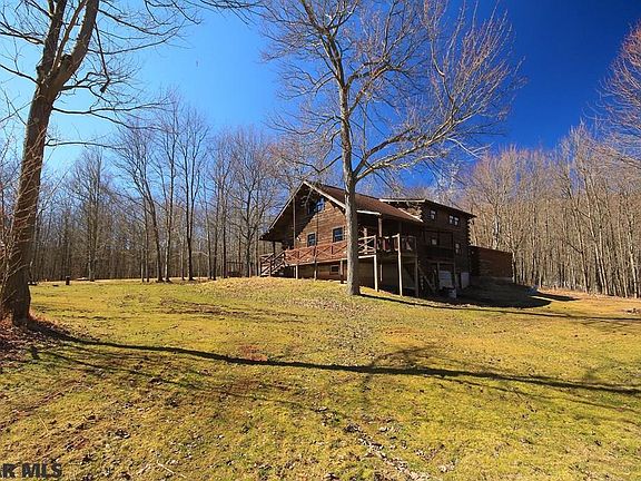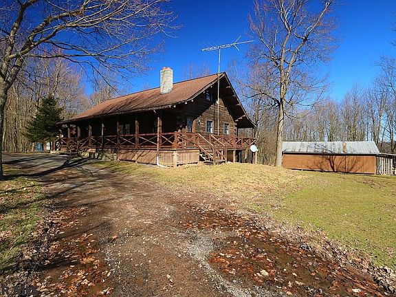 Graceful Tranquility. Resting peacefully on 44.07 secluded acres framing the setting for this cozy log home. Blending harmoniously with the peaceful surroundings. The welcoming wrap-around porch leads to the living room with laminate flooring & a soaring vaulted ceiling with exposed beams open to the 2nd floor. There is a delightful dining room, kitchen, 1st-floor den, first-floor master bedroom, another bedroom & a full bath. Upstairs you will find 2 additional bedrooms & another full bath. The walk-out basement provides plenty of storage & can easily be finished for additional living space. Additional highlights include oil forced air heat, wood stove to help supplement heating costs, rear covered deck, detached 2 car garage & utility building with electric. Escape from the everyday hustle & bustle, truly a commuter's dream only 14.5 miles from State College. Currently enrolled in Clean & Green.