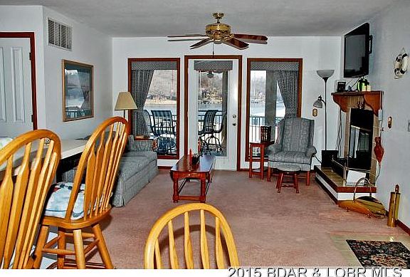 This one-bedroom condo has what you need to enjoy life at Lake of the Ozarks. Sleeps 4 with the hide-a-bed sofa, so bring the kids or friends. Enjoy fishing, boating, or simply relaxing on the large covered deck while escaping the stress of life. In cooler months, relax in front of the cozy fireplace. The private end location and the ability to walk right out your door to the lake front make this condo even more desirable. A slip and a PWC space are included. Newer heat pump - approximately 1 year old.