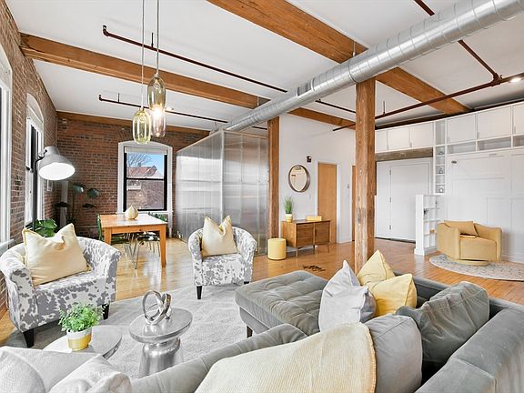 Stunning and spacious loft boasting ideal blend of modern amenities and historical charm with 11-foot ceilings, Boston skyline views, roof deck access, and assigned garage parking. Located 0.7 miles from BU campus and 1.3 miles from Harvard Business School, this bright and open floor plan is bathed in natural light with hardwood floors throughout and charming exposed brick. The inviting living room is open to the dining area and accented by a wall of over-sized windows. Additional bonus space for office with Murphy bed for guests. Kitchen features stainless steel appliances including dishwasher and gas stove installed in 2021 plus new garbage disposal. The primary bedroom is custom fitted for privacy with a generous walk-in closet. Renovated modern full bath with tiled shower, in-unit washer/dryer, and new central heat/AC updated in 2023. Residents enjoy access to common roof deck, elevator access to all four floors of building, and remote control garage access parking for 1 small car.