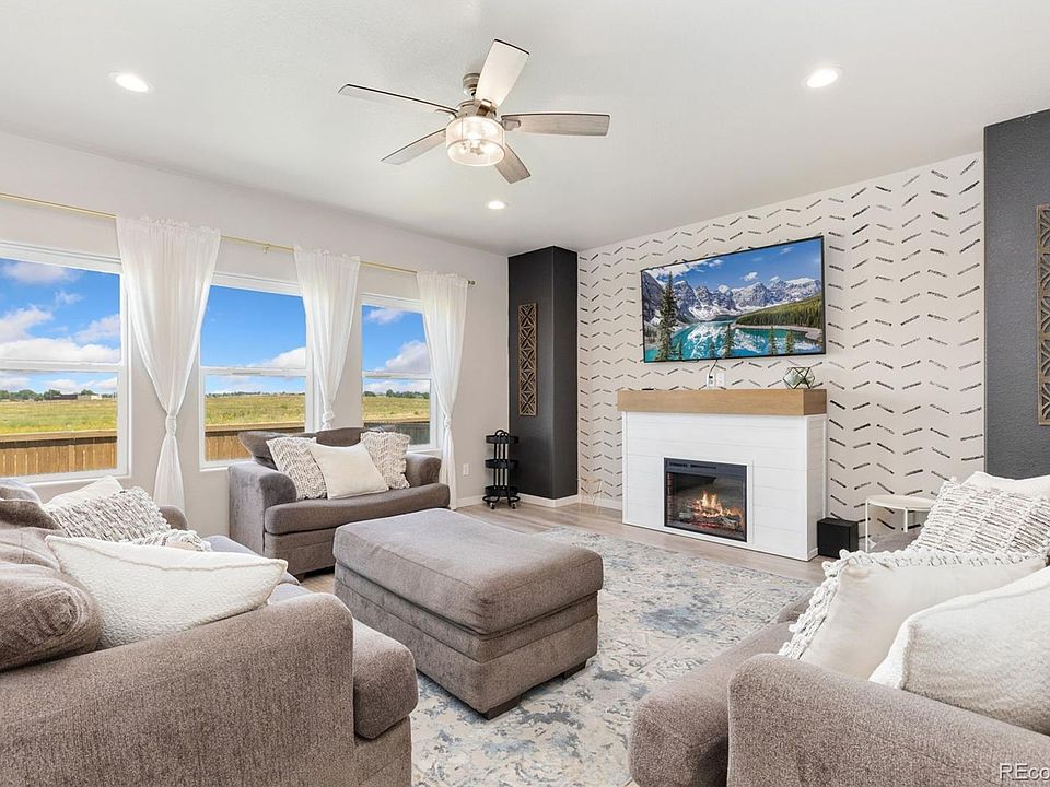 This spacious 4-bedroom home offers 10-foot ceilings on the main floor, a bright open floor plan, and a stunning kitchen with quartz countertops, a massive island, gas stove, stainless steel appliances, large pantry, and abundant cabinet and counter space. The kitchen opens to a sun-filled living room and generous dining area, perfect for entertaining. A main-level flex room provides options for an office, playroom, or hobby space. Upstairs, the luxurious primary suite features a 3/4 bath with quartz counters, double sinks, a large shower with bench and window, private linen closet, and walk-in closet. A sizable loft, three additional bedrooms, and a laundry room in the upper level. The oversized 2-car garage includes a spacious crawl space with excellent ceiling height for added storage. Enjoy a fully landscaped backyard, covered front porch, and window coverings throughout. Conveniently located near schools, shopping, and with easy highway access — this home is truly move-in ready.