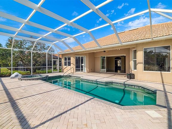 ***HUGE PRICE REDUCTION*** 3-bedroom plus office, 2-bath pool home nestled in the heart of the highly desirable, gated community of Greyhawk Landing where fencing is allowed. Situated on an oversized lot, this home blends comfort, functionality, and Florida elegance. Step inside and be greeted by a spacious open floor plan with soaring tray ceilings, crown molding, and rich wood-style luxury vinyl flooring throughout the main living areas. The heart of the home—the beautifully appointed kitchen with a cozy dining nook. A thoughtfully designed layout creates a seamless flow that’s perfect for everyday living and entertaining. The generously sized primary suite includes a walk-in closet and an en-suite bath with dual vanities, a soaking tub, and a walk-in shower. Two additional bedrooms, a versatile home office, den with built-ins, and a full guest bath provide ample space for family or guests. Step outside to your private oasis where a screened-in pool and spa await, surrounded by lush landscaping and a peaceful preserve backdrop. The lanai with built-in grill is ideal for alfresco dining or relaxing poolside with a good book. Additional highlights include a spacious two-car garage with room to accommodate a third vehicle or extra storage, plantation shutters throughout, and solar panels. This home is just moments from all the exceptional amenities Greyhawk Landing is known for—two resort-style pools, fitness center, tennis and basketball courts, playgrounds, miles of nature trails, and a fishing pier. With a low HOA of just $75/year, this home truly offers an unbeatable combination of lifestyle and value. Don’t miss your opportunity, schedule your private showing today!