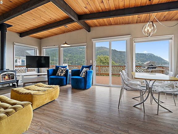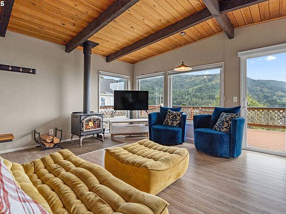 Nestled in downtown Yachats, this has been a successful short term rental in the past. It has sweeping ocean, mountain, and river views. This home is being sold fully furnished! Featuring vaulted wood beamed ceilings throughout, a charming wood stove, two spacious bedrooms, large windows and a fantastic deck to watch the sunsets. The updated kitchen has new countertops and new stainless steel appliances. There is ample storage in the attached garage. Exterior access leads to the 303 sq. ft. daylight basement full of possibilities with roughed-in electrical and roughed-in plumbing for a shower. Make it your dream ADU, guest quarters, or primary suite. Buyer to do their due diligence. This charming home is absolutely turn-key ready and looking for its next owner.