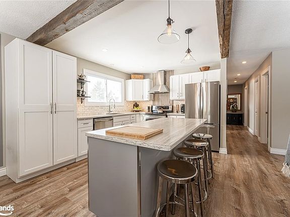 Welcome to your new family home!??This stunning 1.5 acre treed lot offers privacy and tranquility in a quiet neighbourhood. As you enter the home, you'll immediately notice the open concept main floor, which seamlessly blends the kitchen, living, and dining areas together. The space is filled with natural light, creating a warm and inviting atmosphere. This home has been newly updated throughout, making it move-in ready for you and your family. The contemporary kitchen features stainless steel appliances and a large eat-in island, perfect for entertaining guests. The rustic overhead beams add a touch of charm and integrates??beautifully with the modern look. On the main level??you'll find three good sized bedrooms that are bright and inviting. The primary bedroom features an ensuite, providing a private retreat for you to relax in after a long day. The basement offers loads of usable space, including a family room and games room that provide plenty of space for gatherings and entertaining, while the exposed beams add a touch of character. There's also an office space (or 5th bedroom) and an additional bedroom, while the laundry and bathroom round out the space, making it functional and practical. Located in walking distance to one of the best public schools in the area. Kelso beach, park and marina are all a few short minutes away. Overall, this home offers a unique blend of rustic charm and modern convenience. It's perfect for anyone who values privacy and wants to be surrounded by nature, while still enjoying all the comforts of a newly updated home. 2023-03-15