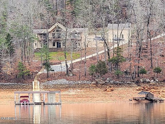 This premier Norris Lakefront property boasts over 155 feet of deep water frontage. This custom built 5BR/ 5BTH/1Half Bath home sits on a gently sloping lot. It has spectacular Open Water and Mountain Views. Built in 2019, this home features an open floor plan. Most rooms have a view of the lake. The main level includes a gourmet kitchen with granite counter tops, large great room with stone fireplace, 2 master bedrooms,half bath, laundry room and large covered porch. The basement includes a large rec room with wet bar, an additional master bedroom and 2 additional bedrooms. The property has a large 2 car garage with an unfinished room above it that could be made into additional living space or a workshop. The concrete path will take you to the firepit and your double slip boat dock.