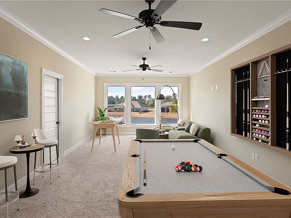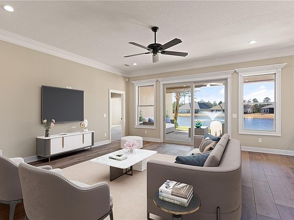 Discover the allure of this exquisite lakefront sanctuary nestled within the prestigious gated community of Fiddler's Cove. Boasting 4 bedrooms, 3 baths, and a bonus room, this spacious residence offers a perfect blend of luxury and comfort. Step into the gourmet kitchen, where custom cabinetry, sleek quartz counters, and under cabinet lighting create an elegant culinary space. With tile floors and crown molding adding a touch of sophistication, the kitchen also showcases a butler's pantry equipped with extra cabinetry, a prep sink, and room for an extra refrigerator. Retreat to the opulent master suite, featuring a sprawling walk-in closet, a luxurious tile walk-in shower, and a generous soaking tub for ultimate relaxation. Throughout the home, tile floors grace the living areas and bathrooms, while plush carpeting adds warmth to the bedrooms. Entertain in style on the expansive back porch, offering serene lake views and an idyllic setting for gatherings and al fresco dining. The upstairs area is quite spacious, offering two oversized bedrooms with a shared full bath, as well as a large bonus room with beautiful lake views that is perfect for family gatherings and entertainment. Making the most of this space could involve creating cozy seating areas, adding entertainment options like a TV or game consoles, and incorporating decor that complements the scenic views. Indulge in a maintenance-free lifestyle with lawn care and irrigation covered by the HOA fees, which also grant access to the community pool and fitness center. Don't miss this rare opportunity to own a piece of lakefront paradise in the coveted Fiddler's Cove community.